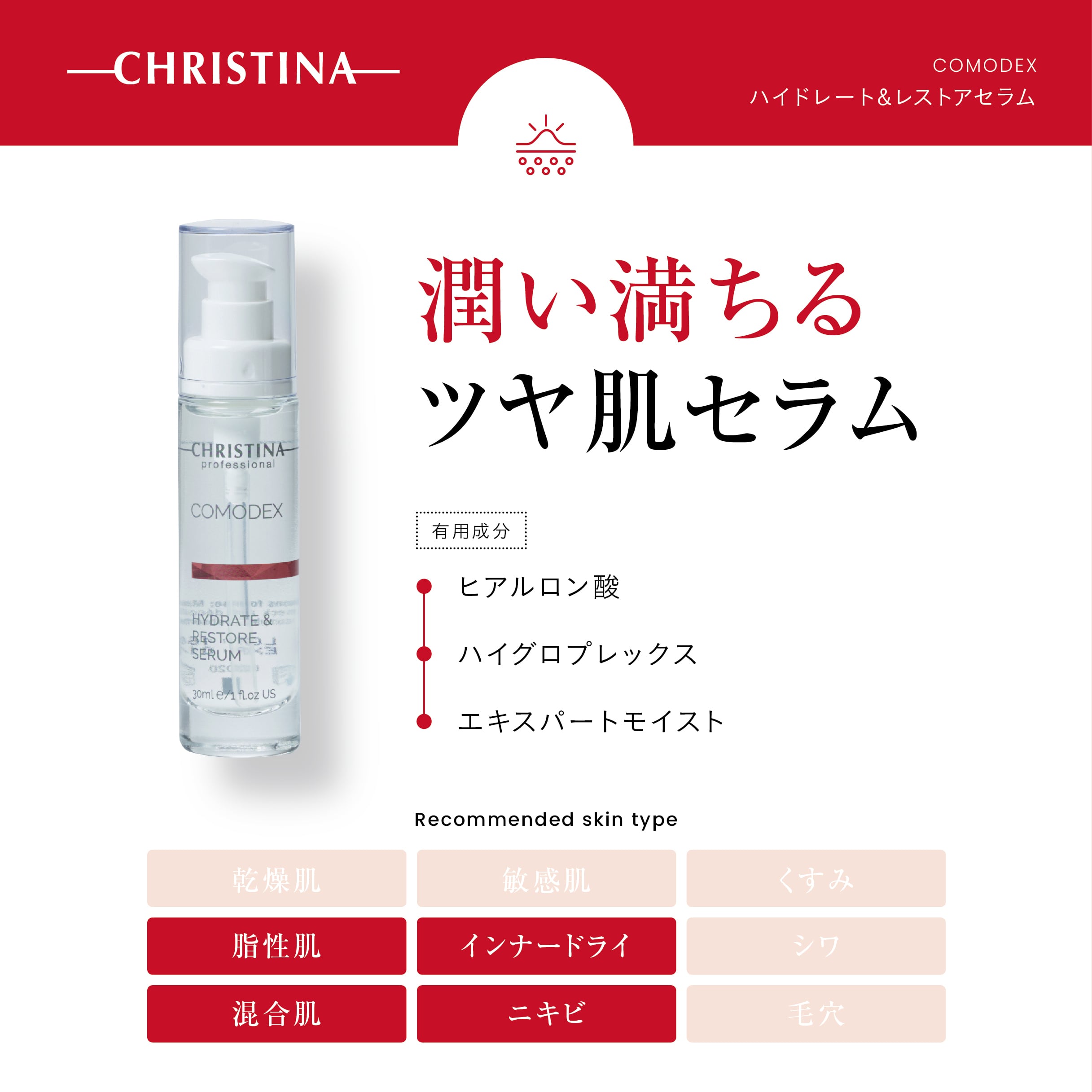 オイルを一切含まずにビタミンCや天然保湿因子で肌に栄養をしっかり補給し肌状態を快適にします。皮脂が多く毛穴が詰まりやすい方・インナードライの方におすすめです。